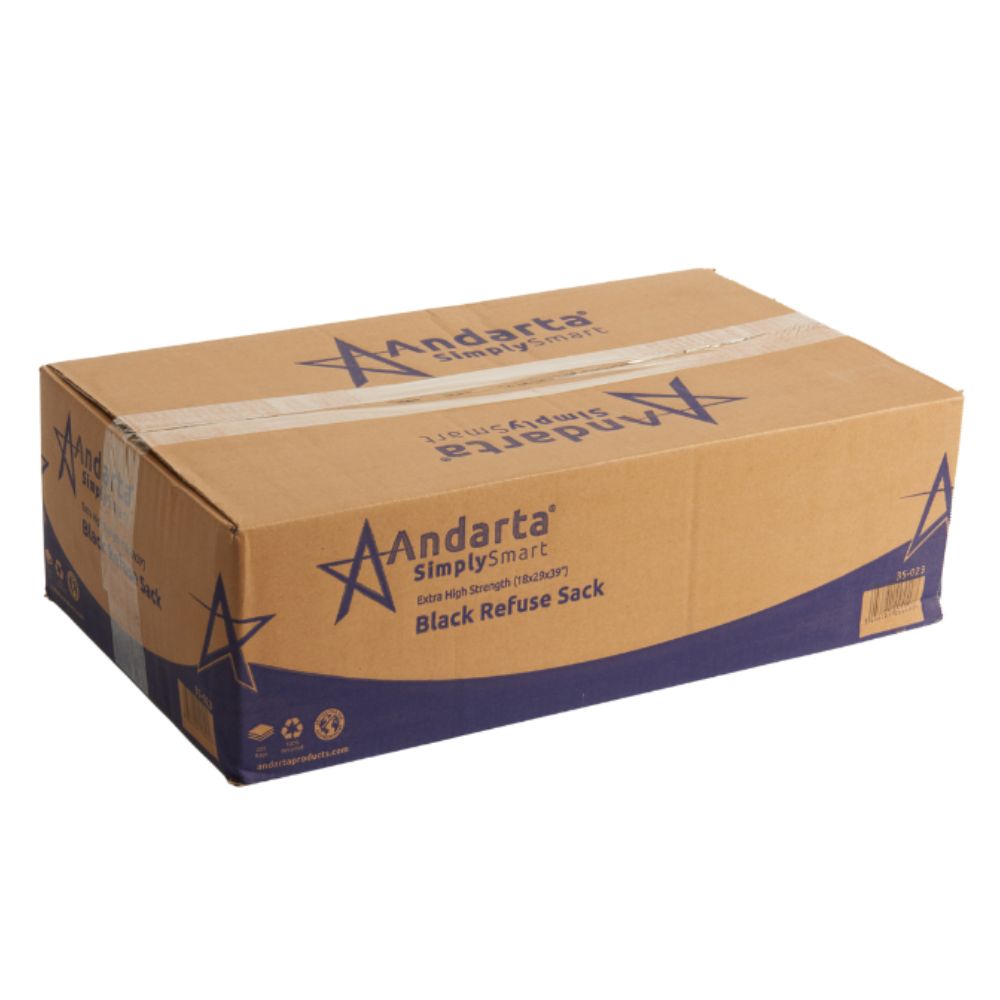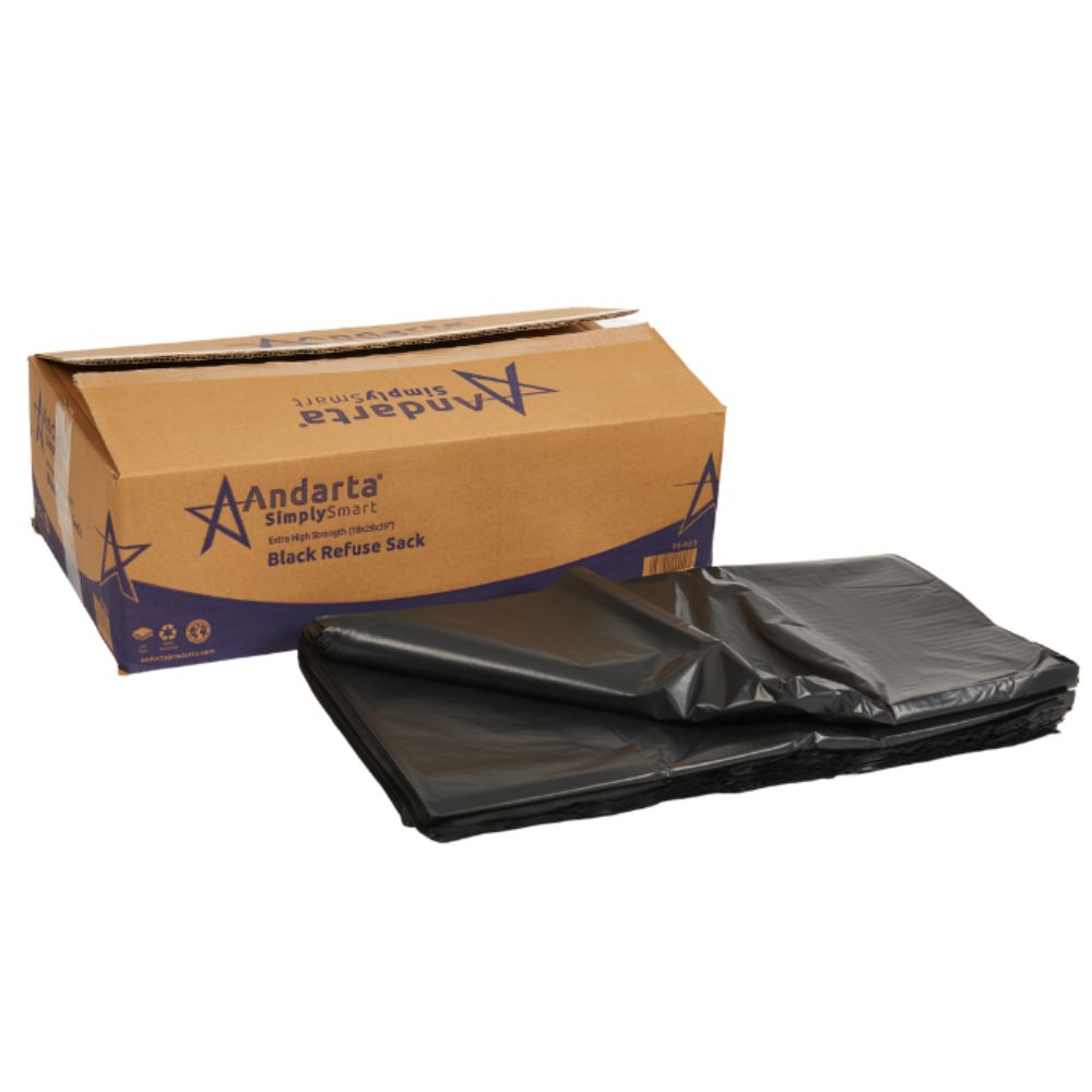Extra high strength refuse sacks from Andarta, ideal for almost any application where regular bin bags cannot be used. Made from 100% recycled polythene taken from post-consumer waste. A superior tear and puncture resistant bag designed to stretch rather than tear. Fantastic value for money, great quality and at a price that doesn't cost the earth.