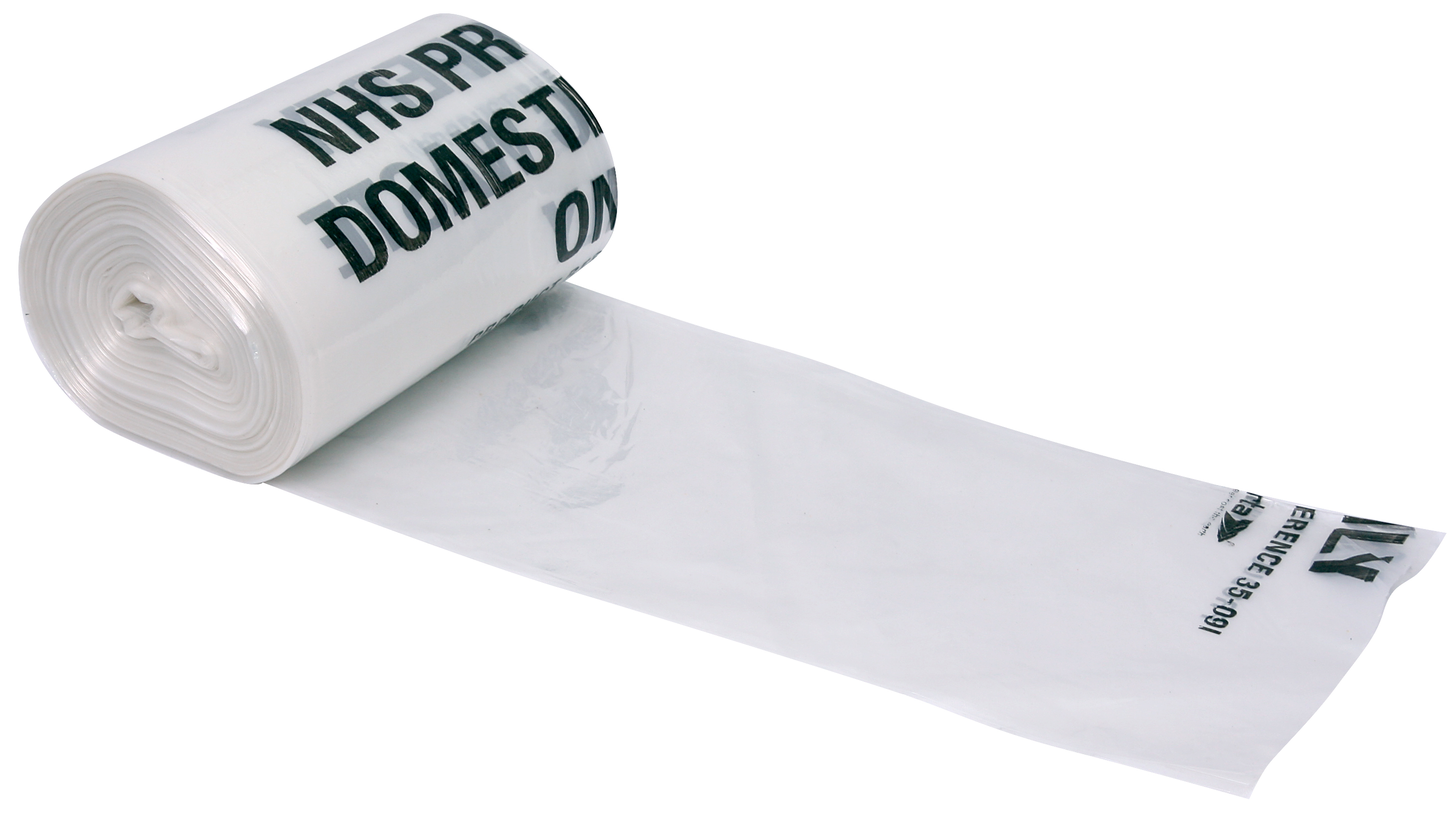 Medium-duty domestic waste sacks. Clear in colour, perfect for general waste and with NHS printed on each sack. This product features a star weld seal on all gusseted sacks and has 50 sacks per roll. Made from recycled polythene taken from post-consumer waste. A superior tear and puncture resistant bag designed to stretch rather than tear. Fantastic value for money, great quality and at a price that doesn't cost the earth.