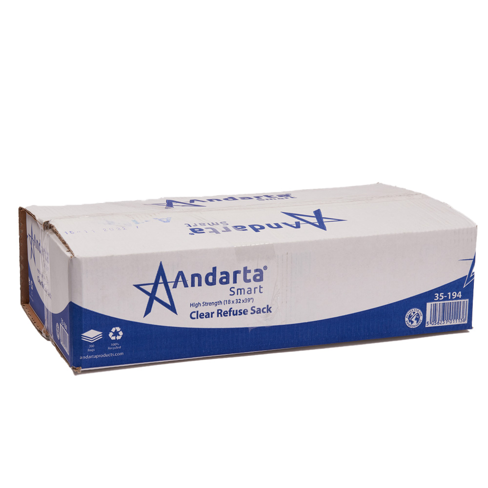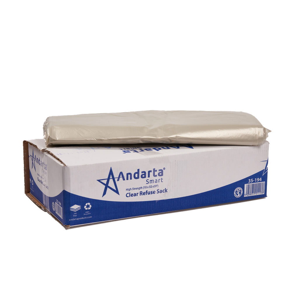 A high strength clear plastic refuse sack made from 100% recycled polythene taken from post consumer waste, providing your business with an eco-friendly choice. These sacks measure 18 x 32 x 39 inches, and come as a case of 200 sacks.