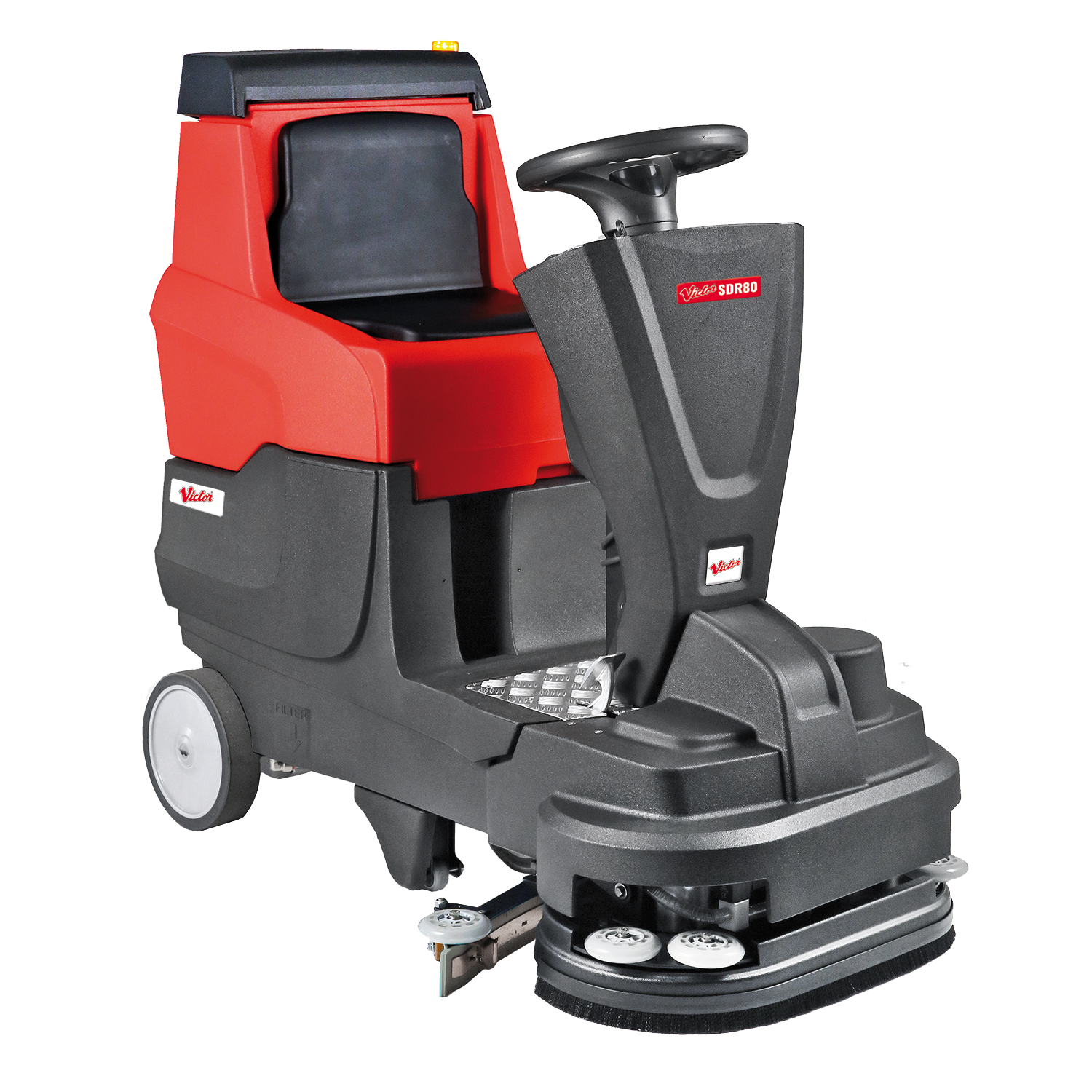 The SDR-80 features the performance and manoeuvrability of a walk behind scrubber dryer, but with the added productivity of a ride-on scrubber dryer. Front mounted brush head increases visibility in operation allowing the operator to see their working area, in addition to being able to get the brushes closer to corners and edges. SDR-80 has been designed to be simple to maintain. Routine maintenance tasks such as squeegee replacement, cleaning the clean-water filter and replacing brushes is fast and easy. The wide opening of the recovery tank makes with easy to access and clean.