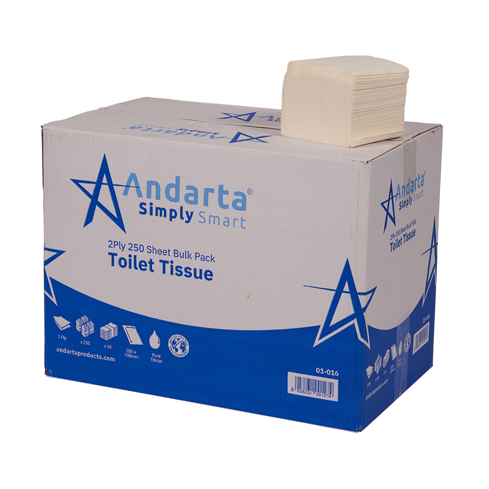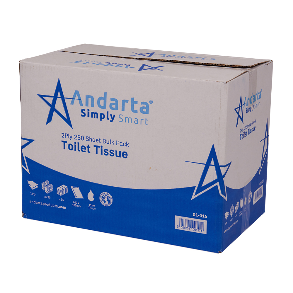 The Andarta brand is synonymous with value and quality and the Andarta 2Ply Toilet Tissue is no exception. An excellent buy for comfort and durability whilst helping to control washroom spend. Dispenses one sheet at a time. 250 sheets per pack. Sold in packs of 36.