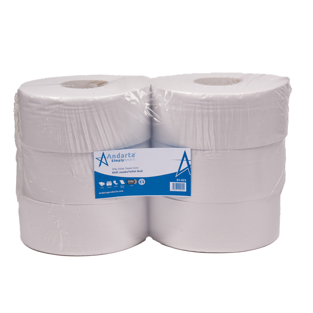 The Andarta brand is synonymous with value and quality and the Andarta 2 ply jumbo toilet roll is no exception. With 250m of toilet paper on each roll, this is an ideal solution for high traffic or infrequently serviced washroom areas. This is a