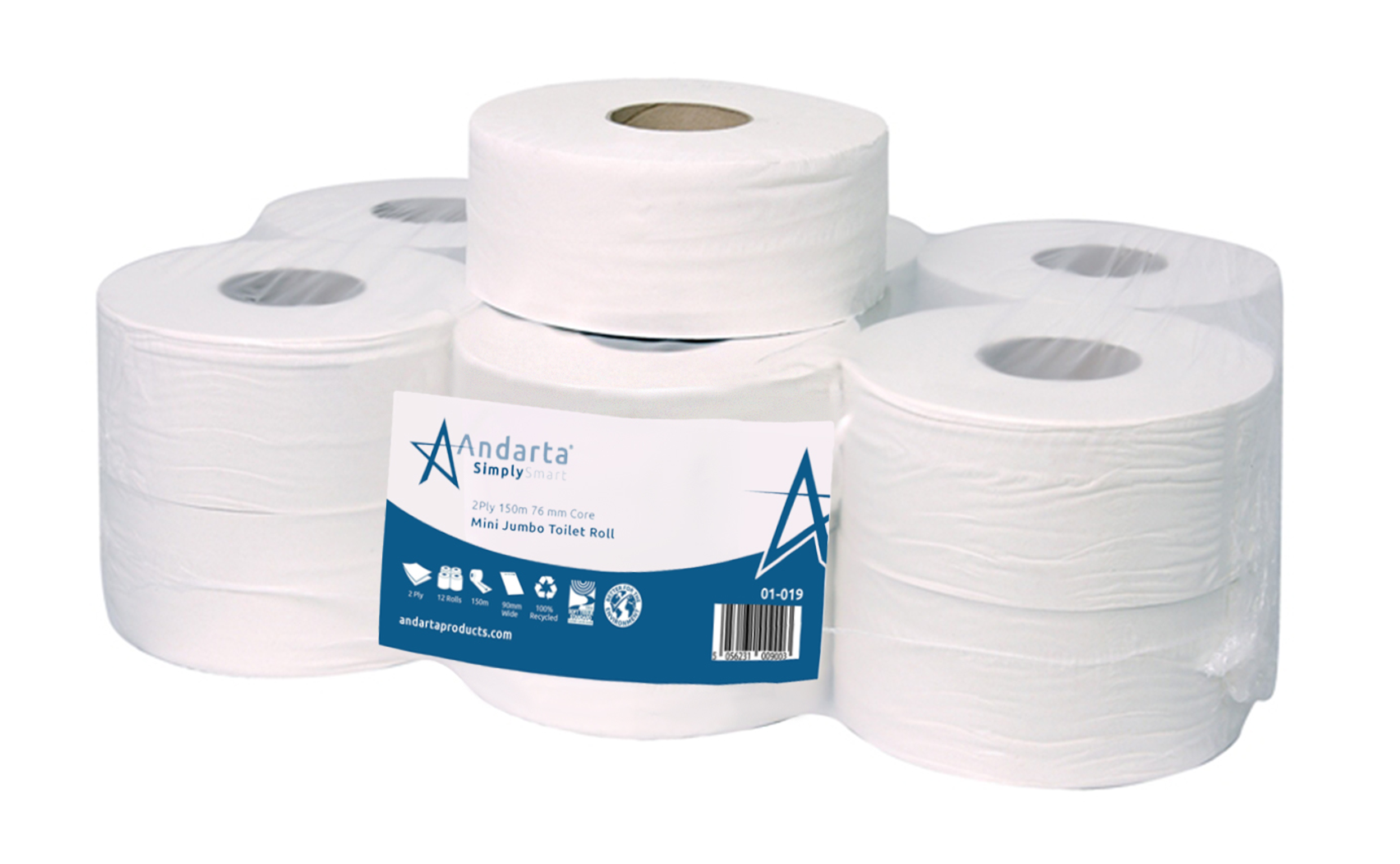 The Andarta brand is synonymous with value and quality and the Andarta 2 ply mini jumbo toilet roll is no exception. With 150m of toilet paper on each roll this is an ideal solution for high traffic washroom areas. 200m mini jumbo or jumbo 300m and 410m products are available.