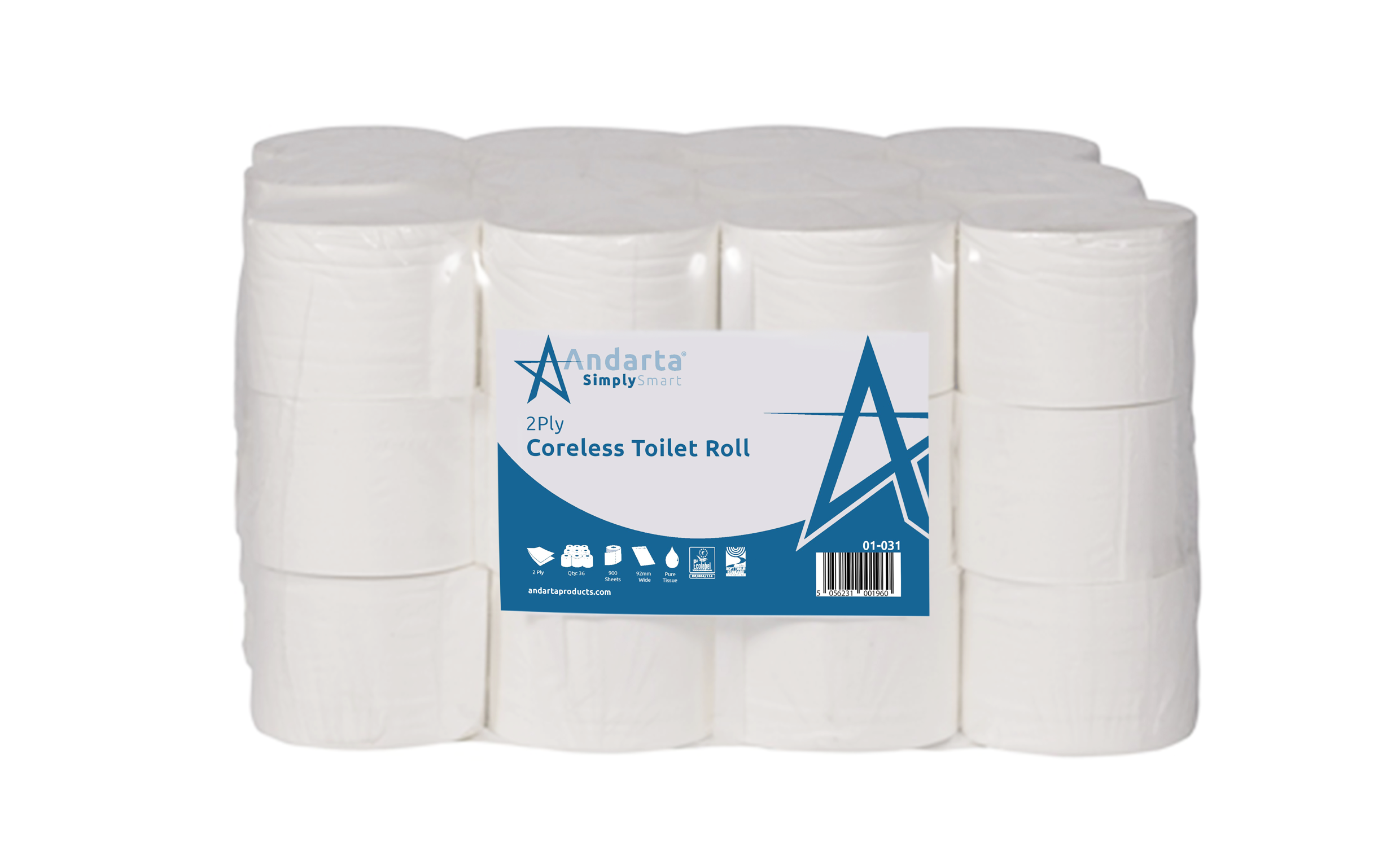 The Andarta 2Ply White Coreless Toilet Roll helps reduce waste and mess in the washroom. High capacity (870 sheets) this toilet roll has a universal hole allowing it to be used with any coreless roll dispenser. Made from 100% pure cellulose with an Ecoflower accreditation, the rolls is soft, absorbent and environmentally friendly.