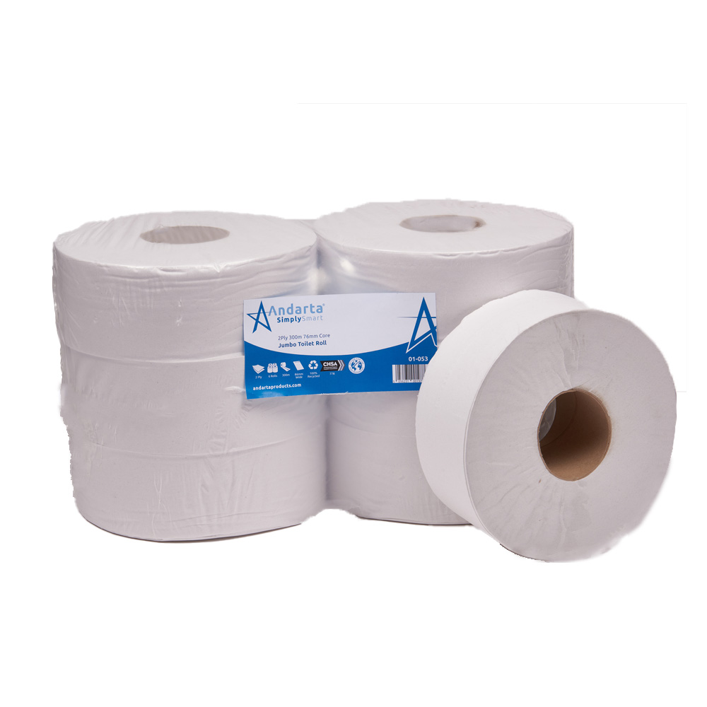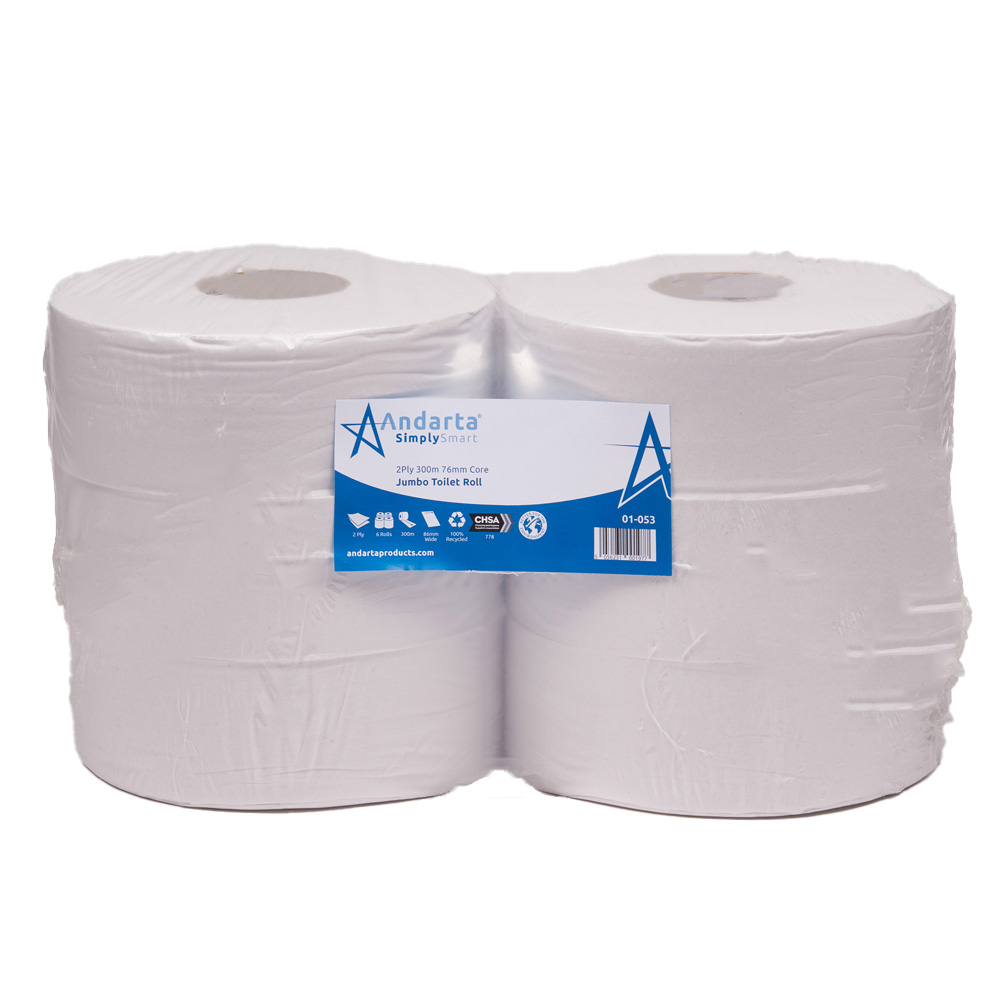 The Andarta 2Ply Jumbo Toilet Roll is a practical and cost-effective toilet paper option for busy washrooms. Each roll contains 300 metres of soft tissue, offering excellent absorbency thanks to its micro embossed finish. With a 76 mm core size, these jumbo rolls are designed to fit standard dispensers, making them ideal for high-traffic or infrequently serviced areas. Made from 100% recycled materials, they provide an environmentally friendly solution without compromising on quality. Supplied in a pack of six, this jumbo size toilet roll ensures long-lasting performance and reduced maintenance.