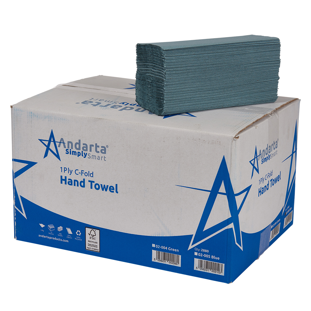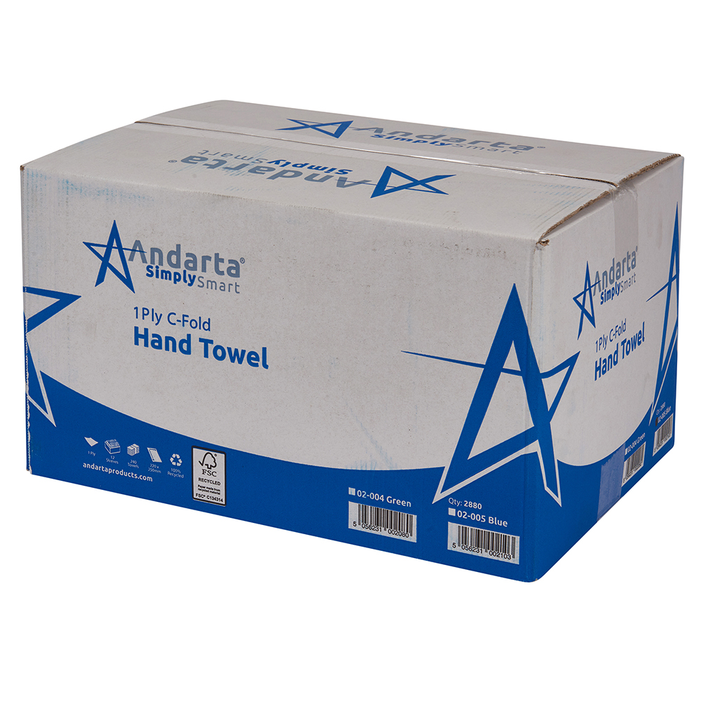 The Andarta 1Ply Blue C/Fold Hand Towel is suitable for use in a wide range of environments, particularly schools, offices, medical practices and industrial units. The blue paper provides superior wet strength and is made from 100% recycled materials, perfect for those wanting 'green' washroom environments.