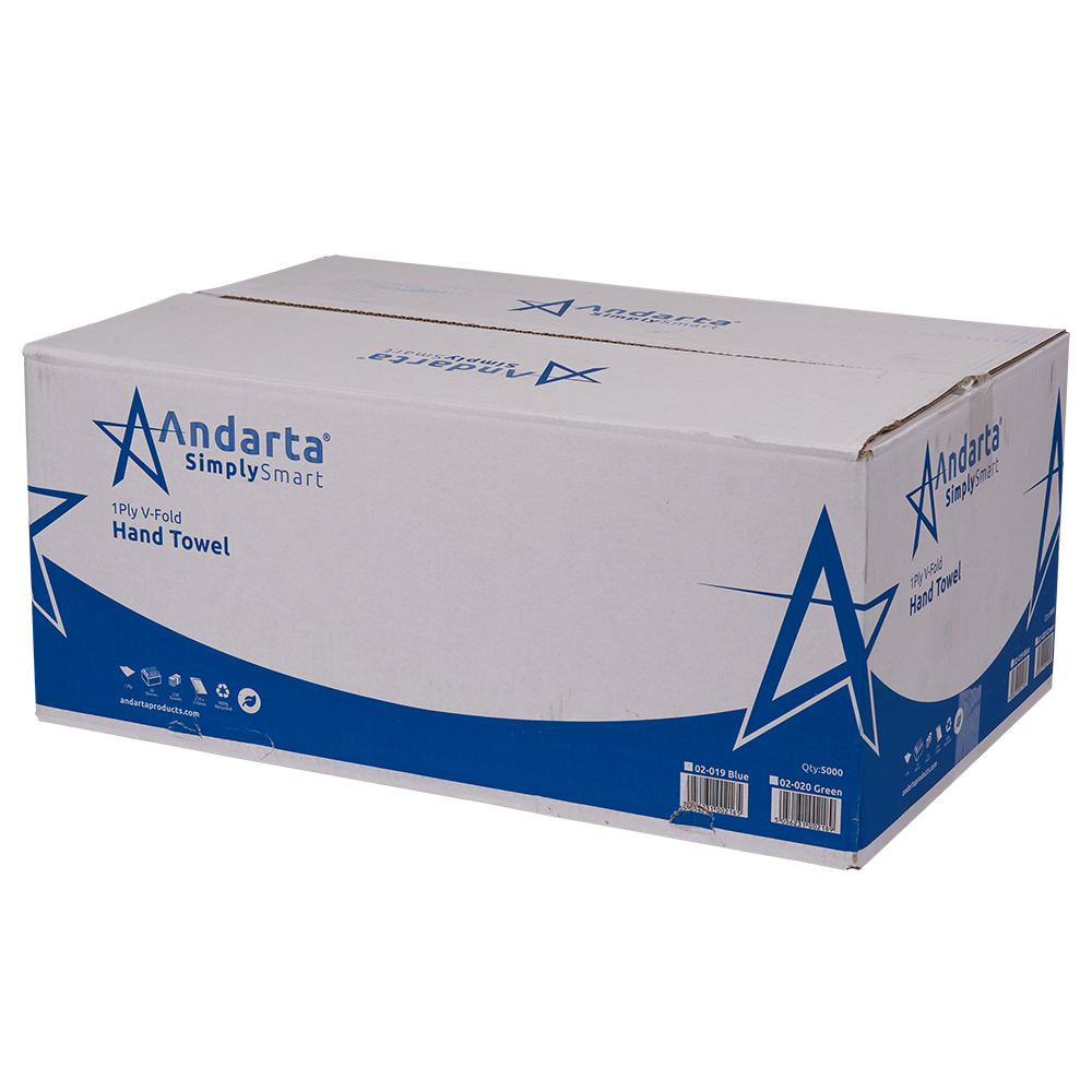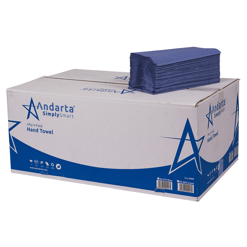 Combining basic performance with great value for money, the Andarta 1Ply Blue V/Fold Hand Towel is suitable for use in a wide range of environments, particularly schools, offices, medical practices and industrial units. V-fold towels are interleaved, meaning the next towel is presented when the first is taken, reducing waste and improving washroom cleanliness. The blue paper provides superior wet strength whilst the embossed finish enhances both look and feel. Made from 100% recycled materials, the towel is an eco-friendly choice for all washrooms.
