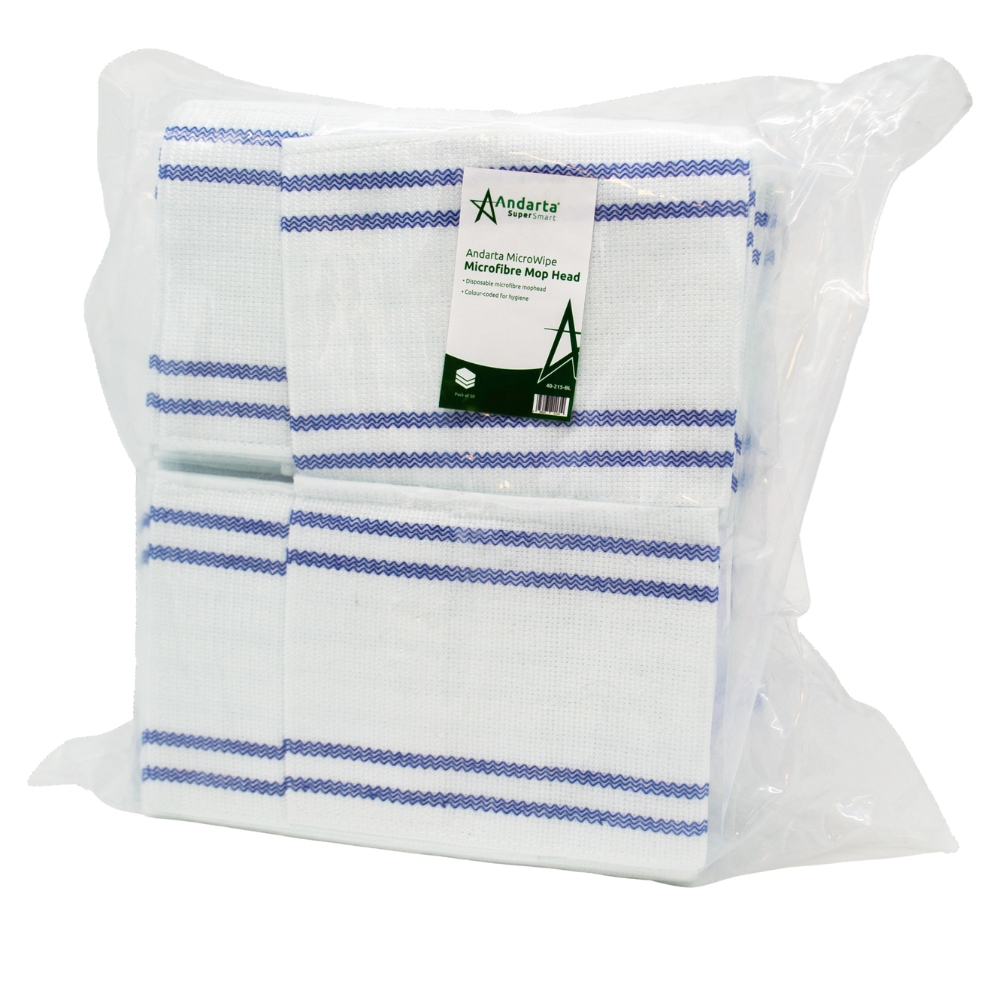 Andarta MicroWipe microfibre mop heads offer single-use convenience with EN 16615 certification. Proven to remove 99.99% of surface bacteria using only water, these low-linting, high wet strength microfiber mop heads are ideal for rapid cleaning performance in hygiene-critical areas like healthcare or food service, especially where laundry access is limited.