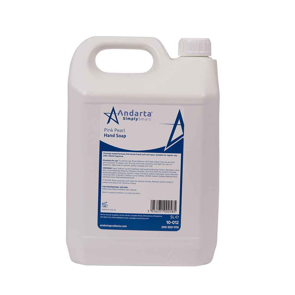 Our Andarta Pink Pearl Hand Soap is designed for washroom environments. An effective hand soap that is mild enough for general use on a regular basis, cleaning and protecting hands. Forming a rich lather, with a fresh floral fragrance. Suitable for use in all types of washrooms. Compatible dispenser codes: 15-164/15-040.