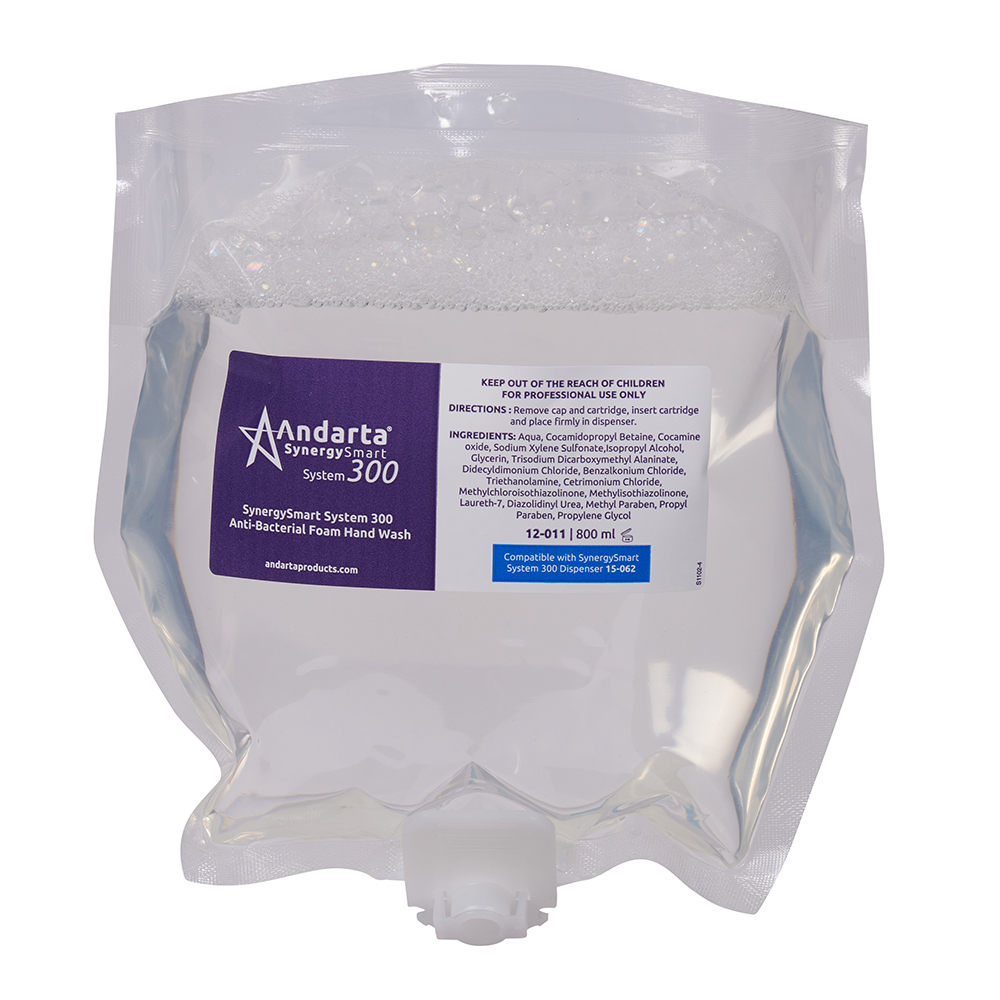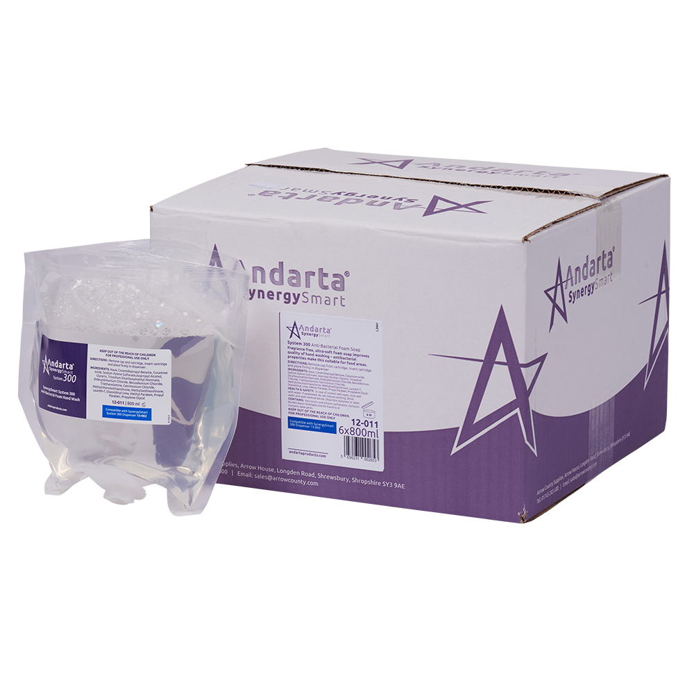 System 300 - Anti Bac Foam Soap Cartridge Andarta antibacterial foam soap is a non-tainting and fragrance free formula. It's alcohol free, ensuring its effective for longer. Doses per cartridge: 1330.