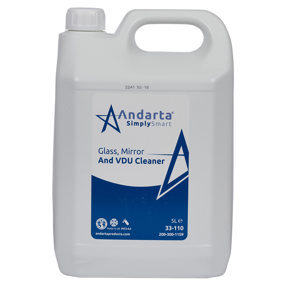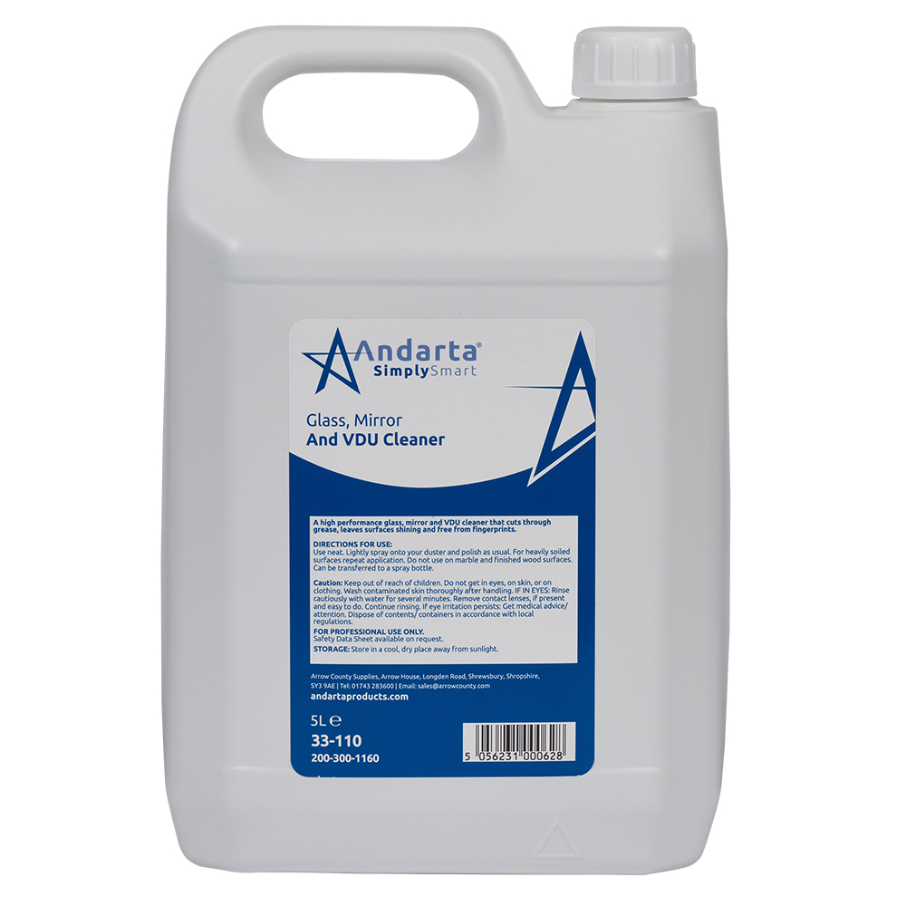 "An excellent cleaner for use on glass, mirrors and display screens, including computer monitors, projector screens and tablet displays. Simply spray on and wipe off for a smear-free finish and brilliant shine. Grease dissolves in an instant and this cleaner will not damage delicate surfaces. Andarta products are designed to be environmentally friendly and rival better known brands on both value and performance. Sold in units of 2x 5 litres.