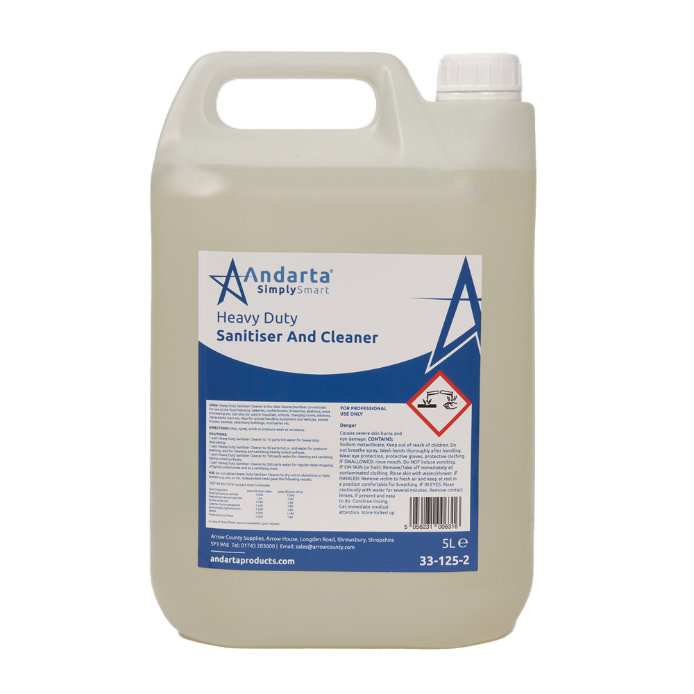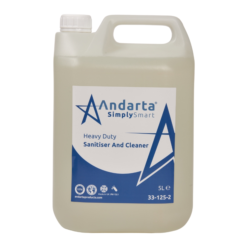 Andarta heavy duty sanitiser and cleaner is a powerful concentrate that has been formulated for the food industry. A versatile and economical cleaning solution that issues a controlled foam formula to disperse and dissolve fats, blood and shortenings in environments such as catering, professional kitchens, food processing plants, factories, bakeries, abattoirs etc. An eco-friendly and cost-effective product, proven against many forms of bacteria.