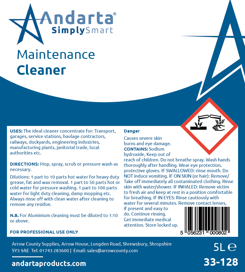 Label for Andarta Industrial Maintenance Cleaner offers powerful cleaning action that removes the heaviest industrial soil. Cuts through grease, oil and grime - ideal for engineering and plant cleaning. Controlled foam for scrubbing, wall washing and pressure washing. Highly concentrated, eco-friendly and cost-effective product, proven against many forms of bacteria.