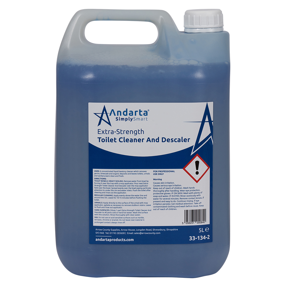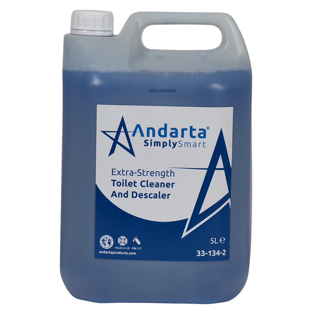 Andarta Extra Strength Toilet Cleaner and Descaler. Totally stainless steel safe so no need to keep away from these surfaces. Removes limescale and organics without brushing. Clings longer for long lasting effect. Pleasant floral fragrance keep the whole of the washroom and toilet area smelling clean and fresh. Sold in units 2x 5Ltrs.