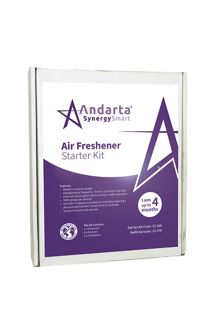 A starter kit from Andarta containing 1 x dispenser, 4 x aerosols and 2 x D batteries that can last up to four months. A complete starter kit as no additional items required, which allows the user to get up and running as quickly as possible. Featuring timed and controlled spray frequency and a day/ night mode, this system can be adapted to numerous applications. Refill fragrances moving forwards offer great value for money, delivering excellent performance at a reasonable cost.