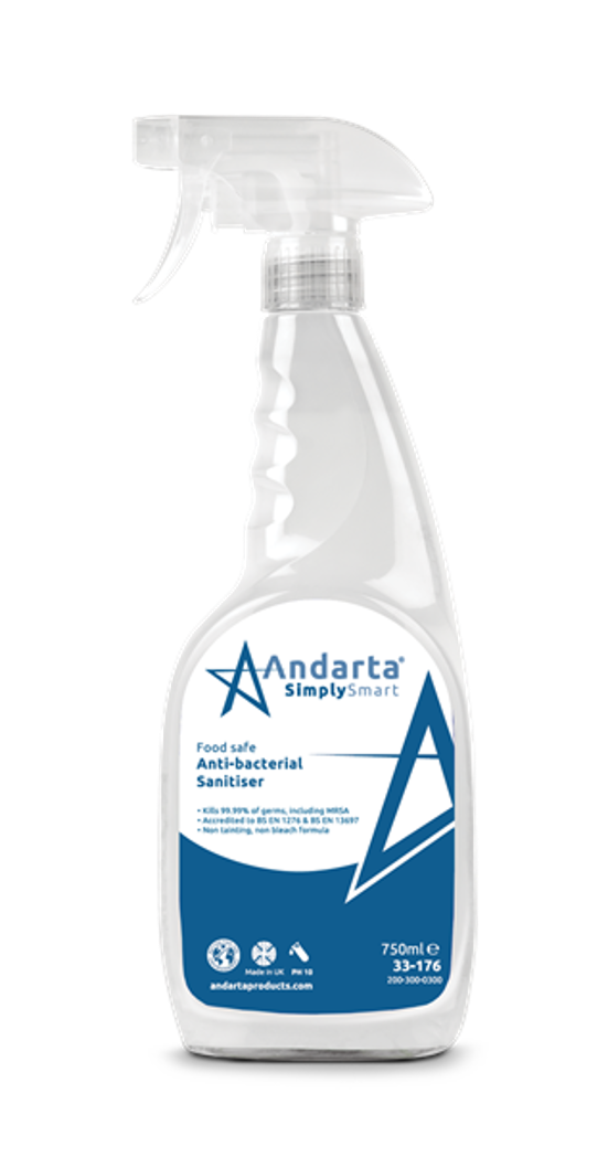 A surface sanitiser spray that removes grease and grime from walls, worktops and food prep areas. A non-tainting food safe formula that kills many forms of bacteria on contact, and is safe to use in commercial kitchens and catering environments. Andarta products are eco-friendly and the perfect choice for quality, performance and value combined. Accredited to EN1276. Sold in units of 1x 750ml.