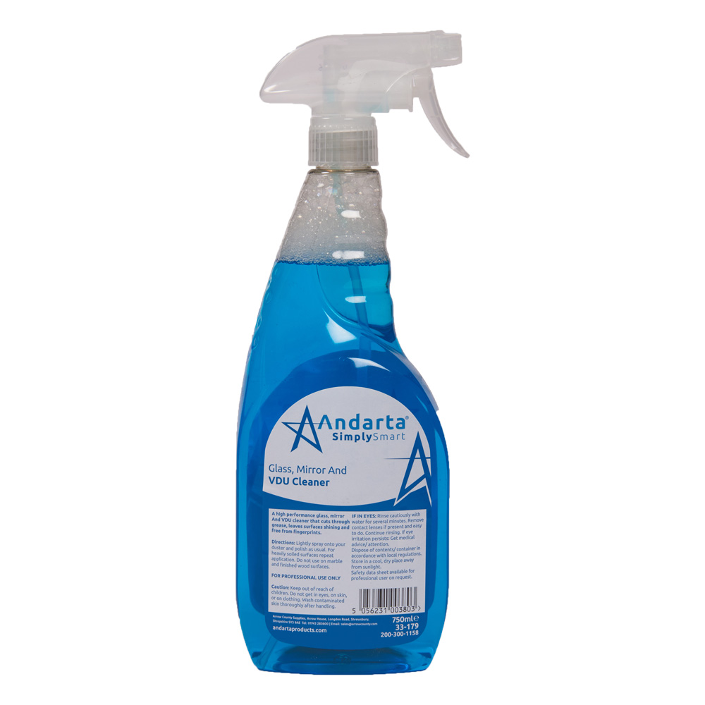 A liquid variation of the wipes, this versatile solution from Andarta can be used to clean windows, mirrors, display cases, windshields, tinted glass, VDU and telephones. Andarta Glass, Mirror and VDU's Cleaner is both cost-effective with quality to rival big name brands and perfect for companies who want to make an environmentally conscious decision.