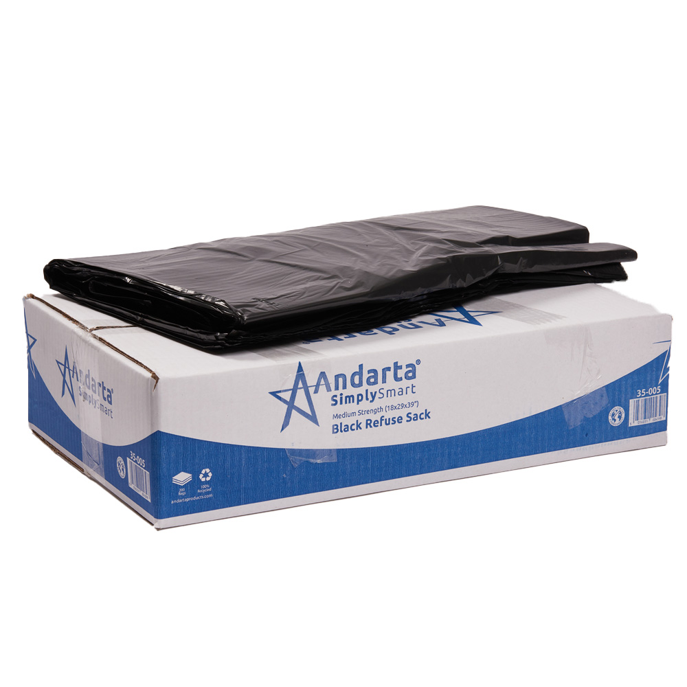 Medium strength, black refuse sacks from Andarta. Made from recycled polythene taken from post-consumer waste. Provides a superior tear and puncture resistant bag as the bag is designed to stretch rather than tear. Fantastic value for money, at a price that doesn't cost the earth.